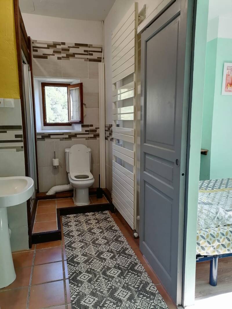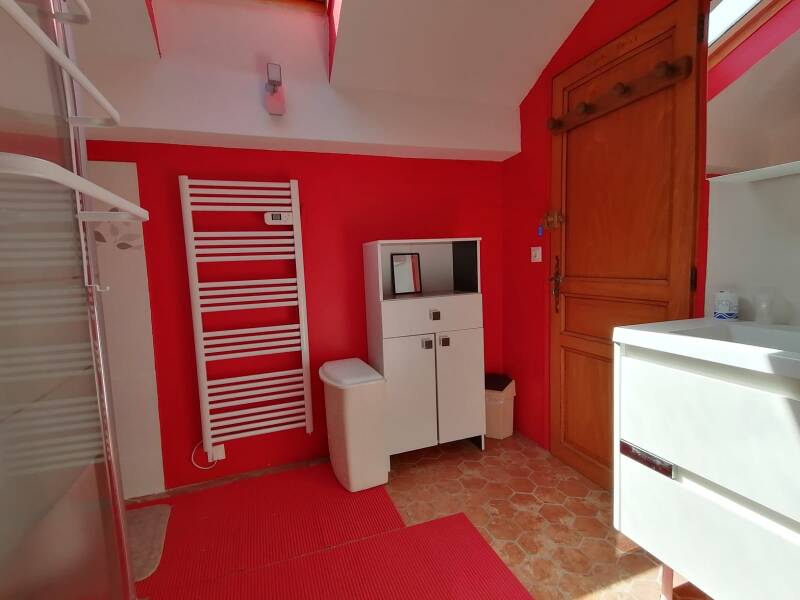 Douche italienne, Toilettes, Lavabo, Rangement. Attention, porte de communication avec la chambre avec une marche!